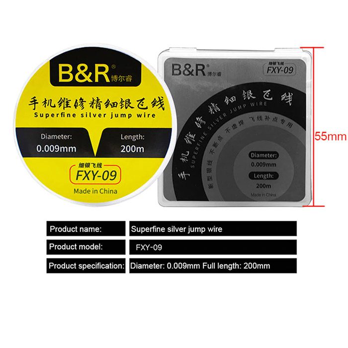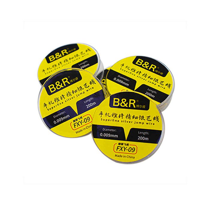 سیم لاکی 0.009 B&R FXY-09 – از نقره خالص ساخته شده و مناسب سیم کشی نقاط قطع شده بر روی مدار برد گوشیهای ایفون است. این سیم بسیار نازک و انعطاف پذیری بالایی دارد و قطر آن در حدود 0.009 میلیمتر است و به راحتی میتوان سیم را خم و راست کرد بدون هیچ گونه قطع شدن برای ترمیم فینگر پرینت و سیم کشی نقاط قطع شده استفاده کرد. طول این حلقه سیم 200 متر میباشد. هنگام تعمیرات در کنار سیم لاکی باید از دستگاه مخصوص سیم لاکی استفاده شود.