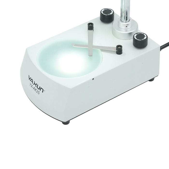 لوپ آنالوگ دو چشم AK25 توسط شرکت YAXUN که یکی از تولیدکنندگان ابزار تعمیرات موبایل در چین است ،طراحی و تولید شده است . فاصله کاری این لوپ یاکسون 10 سانتی متر میباشد . قدرت بزرگ نمایی این لوپ 2x و 4x میباشد . همچنین دارای لامپ LED است که باعث روشنایی میزکار شما میشود تا بتوانید بهتر قطعات ریز را در زیر لوپ مشاهده کنید.