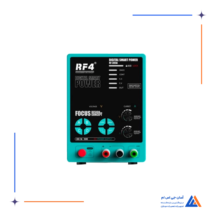 منبع تغذیه RF4 RF-305A با ولتاژ ورودی 110 تا 220 ولت و فرکانس 50/60 هرتز، توان خروجی 0 تا 30 ولت و جریان خروجی 0 تا 5 آمپر را فراهم می سازد و دارای توان کلی 150 وات می باشد. این دستگاه دارای قفل صفحه و امکان قطع خروجی ولتاژ با کلید بوده و از دقت نمایش جریان تا 3 رقم اعشار برخوردار است. وجود فن خنک کننده باعث پایداری عملکرد در استفادههای طولانی مدت شده و دو صفحه نمایش اطلاعات را به صورت دقیق و همزمان نمایش می دهند. دستگاه دارای 4 کانال ذخیره A، B، C، D برای استفاده سریع از تنظیمات مختلف است.