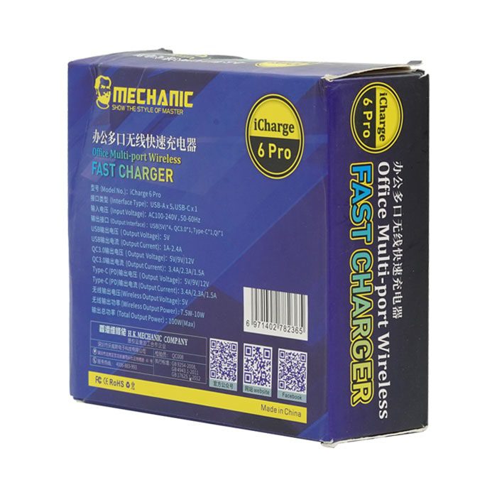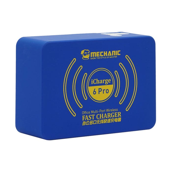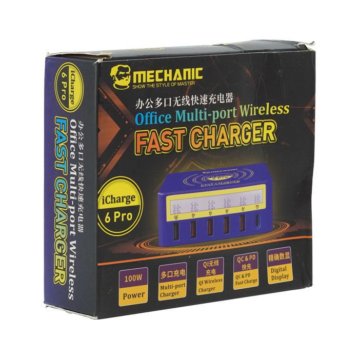 مولتی شارژر مکانیک icharge 6PRO – مولتی شارژر در تعمیرات موبایل یک دستگاه است که برای شارژ همزمان چندین دستگاه موبایل استفاده می‌شود. این دستگاه به صورت یک واحد کوچک و قابل حمل طراحی شده است و از طریق یک منبع تغذیه به برق متصل می‌شود. با استفاده از مولتی شارژر، می‌توان چندین تلفن همراه، تبلت، لپ تاپ و سایر دستگاه‌های الکترونیکی را به صورت همزمان شارژ کرد. این دستگاه به عنوان یک جایگزین مناسب برای شارژگرهای اصلی دستگاه‌ها استفاده می‌شود و در صورت نیاز به شارژ همزمان چندین دستگاه، عملکرد آسان و کارآمد را فراهم می‌کند. شارژر رومیزی مکانیک که برای تعمیرکاران موبایل ابزاری کاربردی هست. این هاب شارژ دارای 6 پورت هست و دارای وایرلس شارژ هم می‌باشد که فقط برای تست WIRELESS موبایل مورد استفاده قرار می‌گیرد و برای شارژ کردن کامل مناسب نیست.