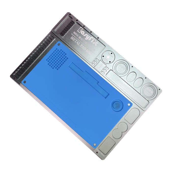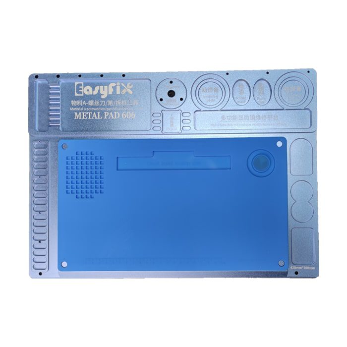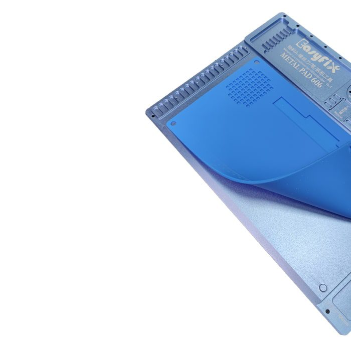 پد فلزی ایزی فیکس EasyFix مدل TE-606 – در پروسه تعمیرات موبایل مانند باز و بسته کردن اجزای موبایل ، لحیم کاری ، کار با لوپ، برای سهولت در کار از پد نسوز مغناطیسی سیلیکونی به عنوان میز کار استفاده می شود. این پد نسوز شامل پد مغناطیسی (مگنتی) و یک پد کوچک تر سیلیکونی می باشد که روی پد مغناطیسی قرار گرفته است.