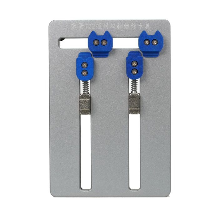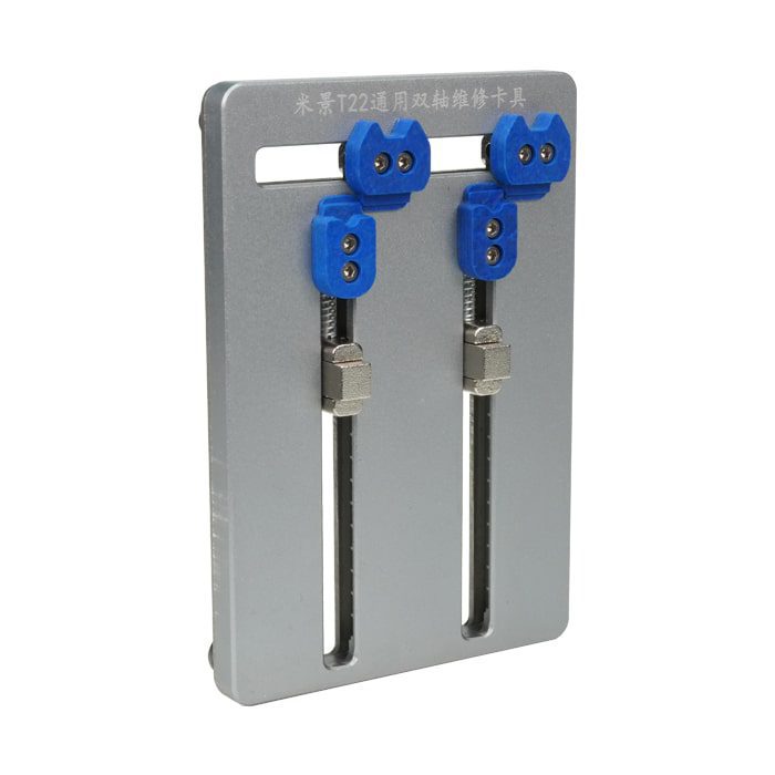 گیره برد Mijing t22 – این فیکسچر مناسب نگهداری انواع برد و آی سی گوشی های موبایل هنگام لحیم کاری و یا پاک کردن چسب آی سی و دیگر قطعات میباشد. گیره برد یونیورسال به شدت در برابر حرارت مقاوم است.این فیکسچر را می توان در فواصل مختلف سطح بالا متوسط و پایین تنظیم کرد، زیر قسمتی که برد قرار میگیرد آزاد می باشد تا حرارت در زیر برد فشرده نشود و به قطعات زیرین آسیبی نرساند.همچنین در قسمت اصلی فیکسجر دو پیچ برای فیکس شدن برد روی گیره قرار دارد.مدل T22 یونیورسال از برند MJ دارای دو محور متحرک عمودی می باشد.