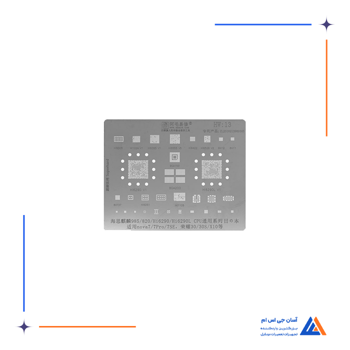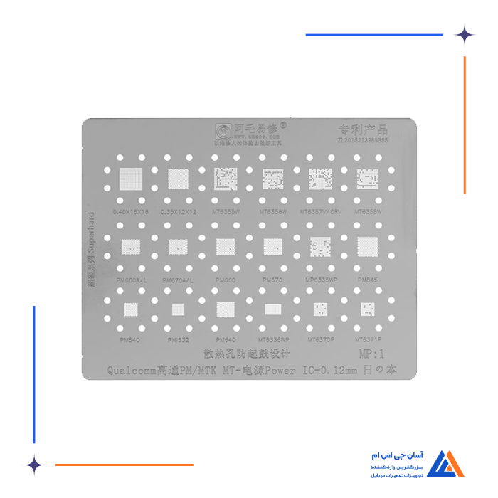 - شامل انواع شابلون های مخصوص ریبال و شابلون های IC برای مدل های مختلف موبایل و بردها، مانند شابلون EMMC:1 و شابلون همه کاره یونیورسال که برای ریبال قطعات BGA و IC کاربرد دارند.
