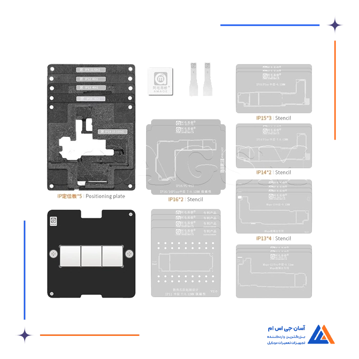 آمویی برند شناختهشده ابزار ومتعلقات تعمیرات موبایل؛شامل شابلونهای BGA/IC، خمیر وفلکس، روغن لحیم، ابزار تزریق ومصرفیهای کارگاهی. انتخاب کاربردی برای میز تعمیر
