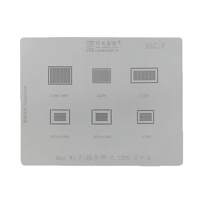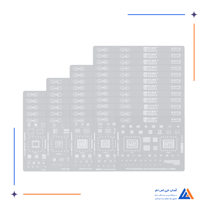 - شامل انواع شابلون های مخصوص ریبال و شابلون های IC برای مدل های مختلف موبایل و بردها، مانند شابلون EMMC:1 و شابلون همه کاره یونیورسال که برای ریبال قطعات BGA و IC کاربرد دارند.